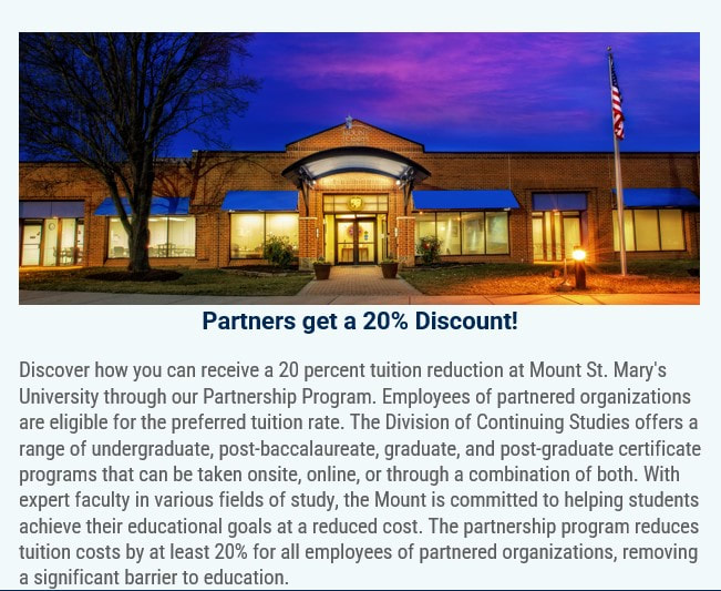 The Fort Detrick Alliance is proud to participate in the partnership program with Mount St. Mary's University-Frederick Campus. Contact Valerie Pearson, v.e.pearson@msmary.edu, for more information.